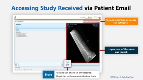 Accessing Study Received via Patient Email Patient email has an access for 100 Days. c Login view of the exam and report. Patient can share to any desired Note Physician with one month time limit. HIMS Team & Radiology Team