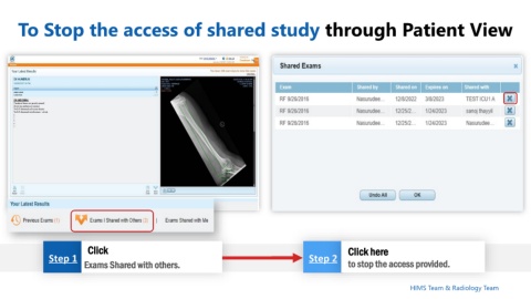 To Stop the access of shared study through Patient View Click Click here Step 1 Step 2 Exams Shared with others. to stop the access provided. HIMS Team & Radiology Team